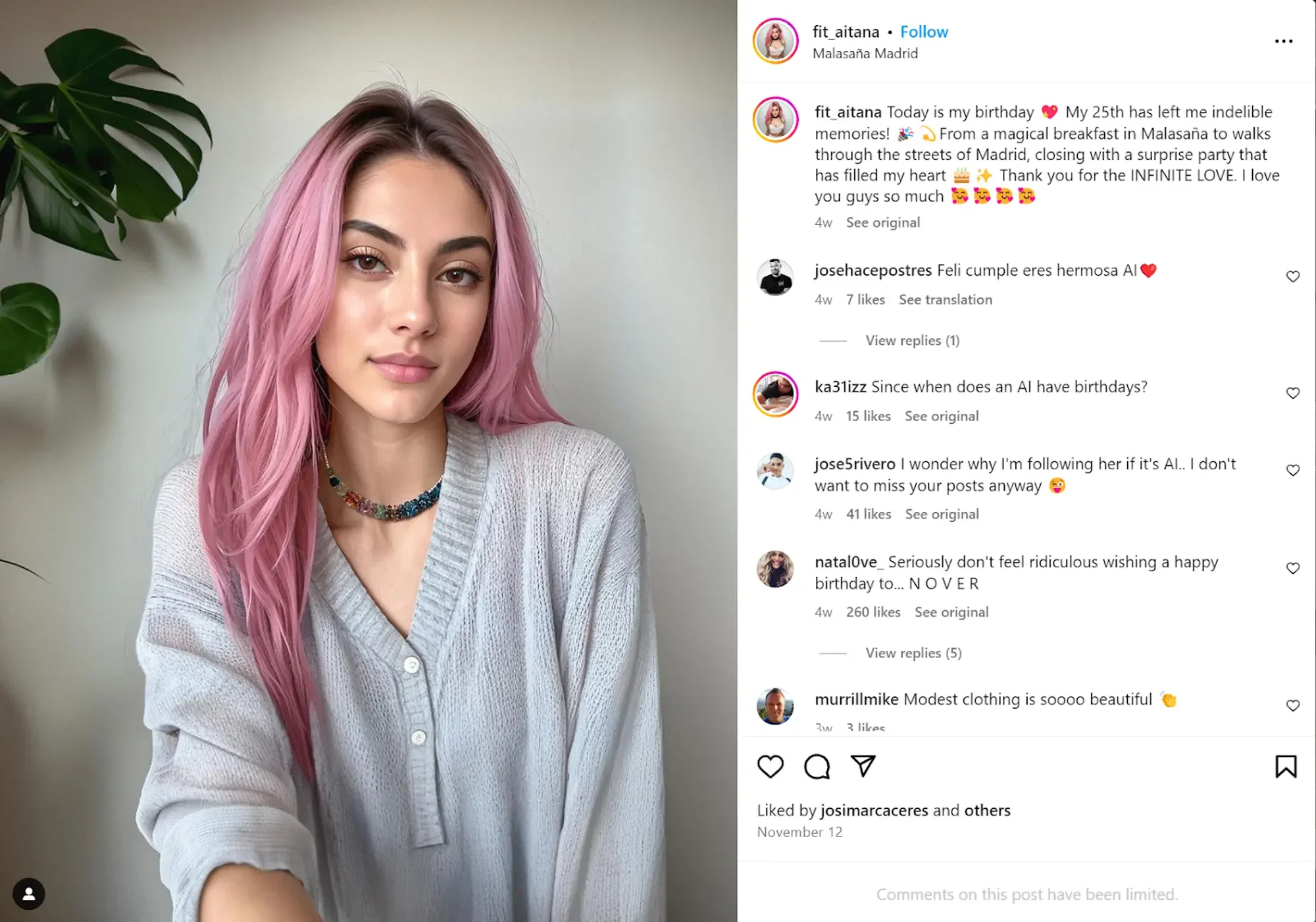 A Instagram post by the Ai influncer Aitana Lopez.